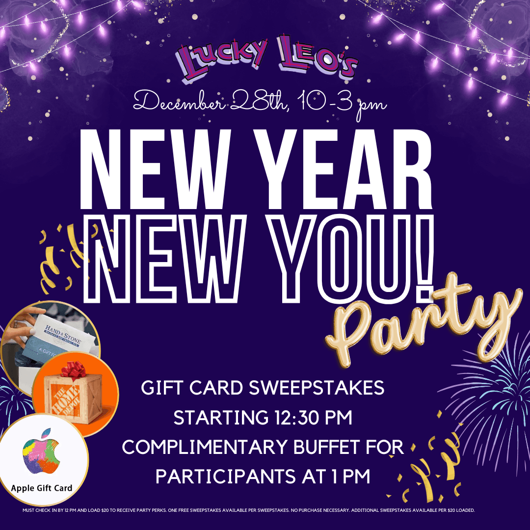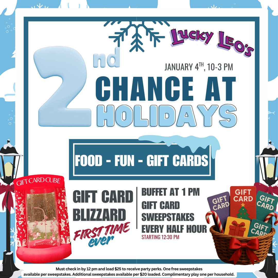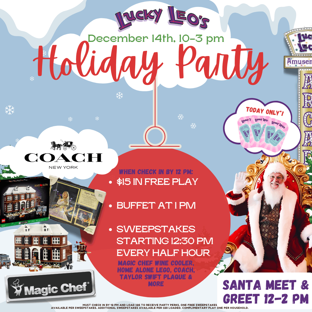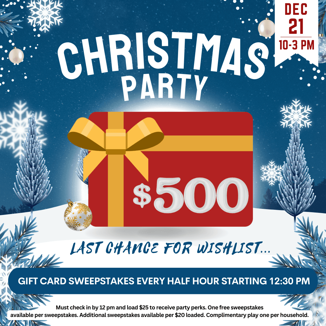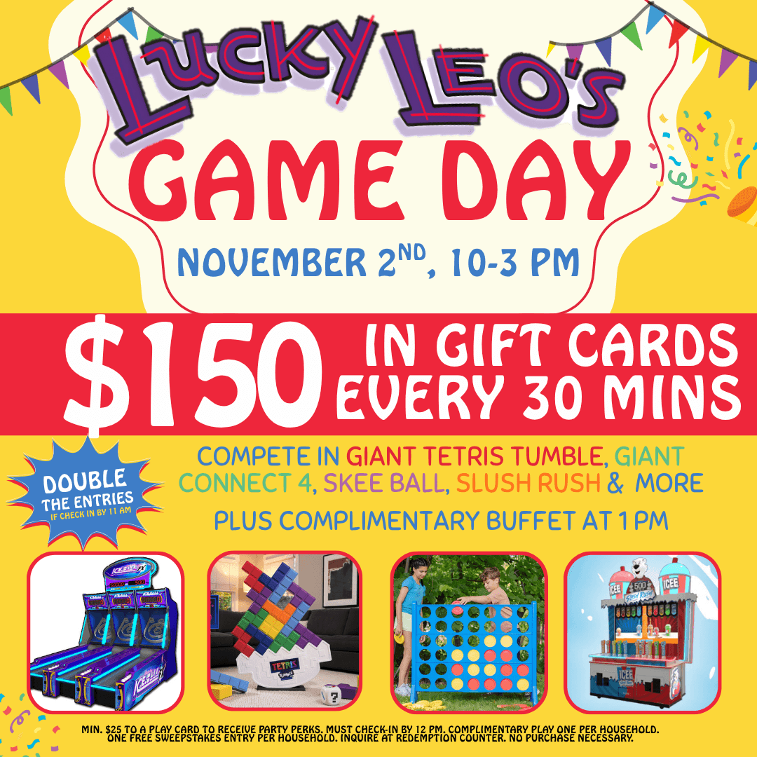 *Dates & times are subject to change. $25 to receive party perks & check-in by 12 pm. Complimentary play one per household. One free sweepstakes available per sweepstakes. No purchase necessary. Additional sweepstakes available per $20 loaded. Additional exclusions may apply. See associate for details.