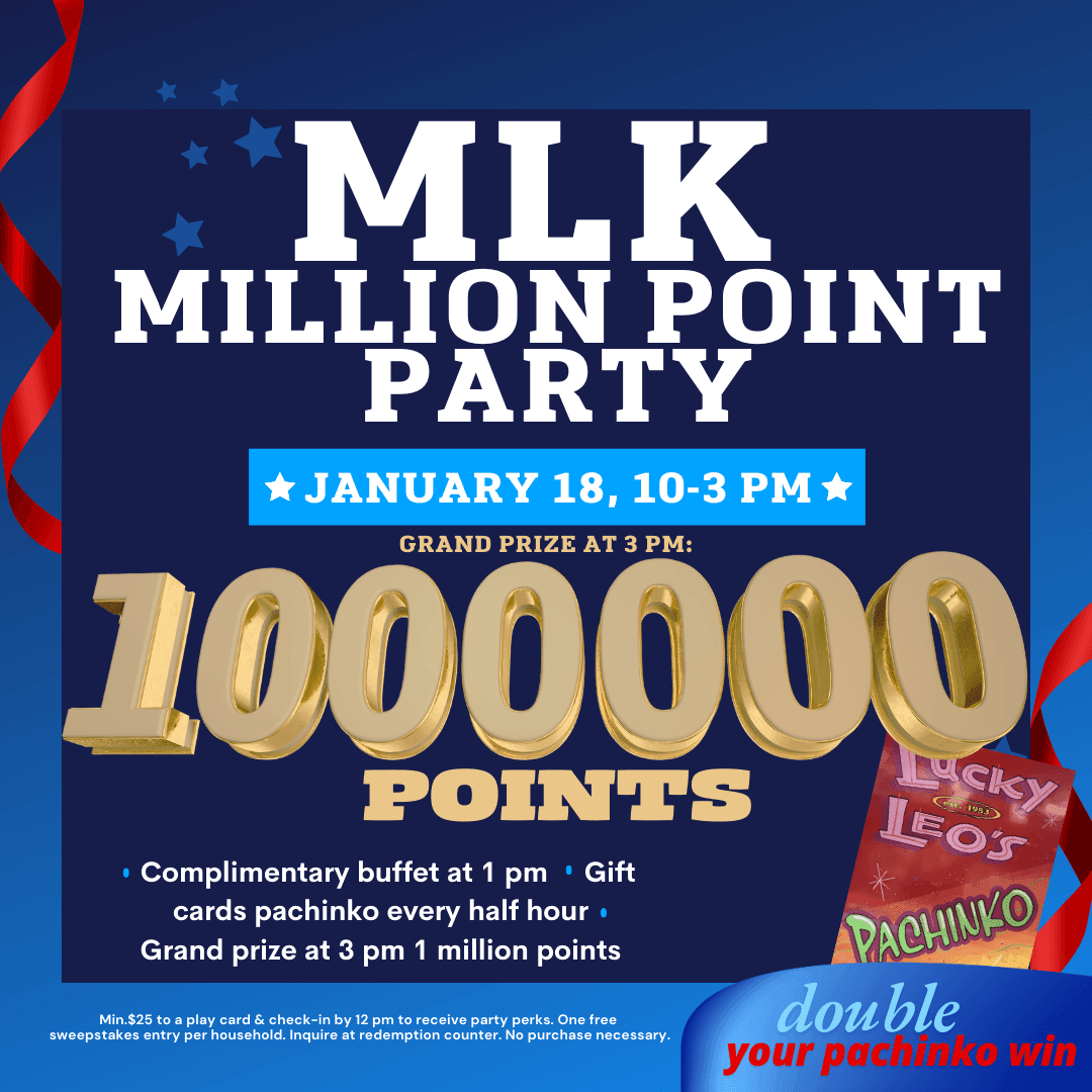 *Dates & times are subject to change. $25 to receive party perks & check-in by 12 pm. Complimentary play one per household/vip account. One free sweepstakes available per sweepstakes. No purchase necessary. Additional sweepstakes available per $20 loaded. Additional exclusions may apply. See associate for details.